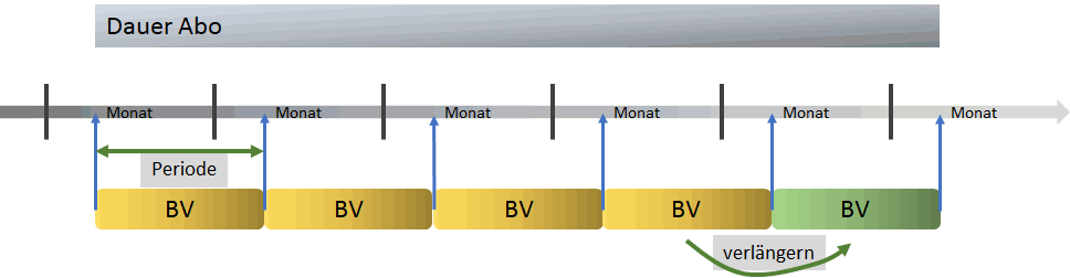 In der folgenden Skizze ist das an einem Pensions-Abo dargestellt. Zu dem Dauer-Abo gehören alle Betreuungsvereinbarungen (BV) in der Skizze. Bei Verlängerung wird jeweils eine neue BV erzeugt.