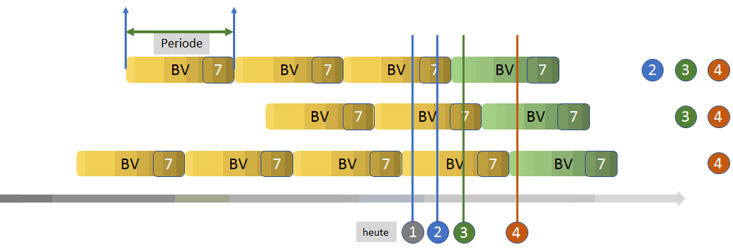 Im obigen Beispiel sind drei Fortlaufende Abos dargestellt, die jeweils bereits mehrfach verlängert wurden. Zum Zeitpunkt der Verlängerung (1), (2), (3), (4) gibt es die grünen BVs am rechten Ende der Zeilen noch nicht. Die Funktion Abos verlängern funktioniert dann wie folgt: