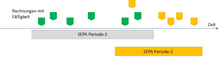 Im Beispiel ist eine zweite SEPA-Periode skizziert, welche die erste überschneidet. Aus dem Überschneidungsbereich werden nur die neu hinzugekommenen Rechnungen (gelb) für die zweite SEPA-Datei berücksichtigt.