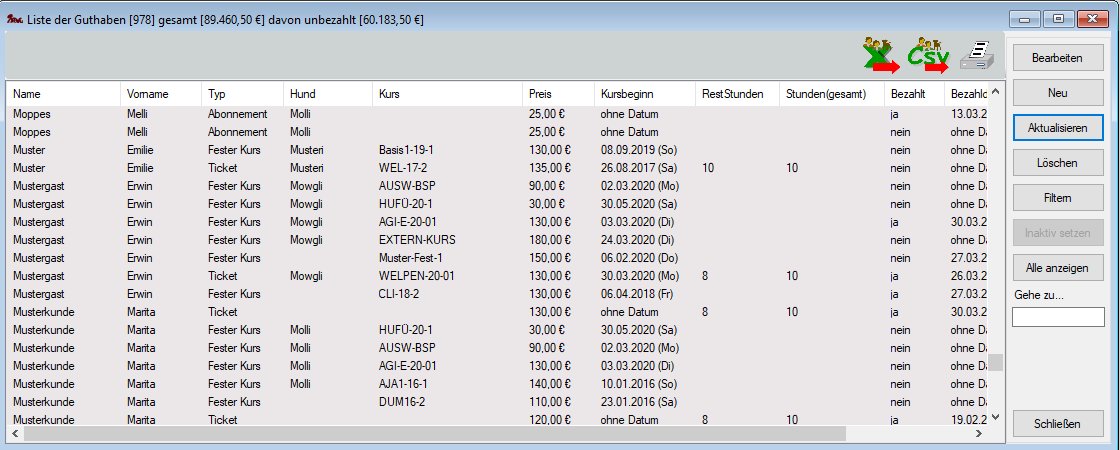Die Liste der Guthaben (Tickets, Abos und Kurs) erreicht man über das Menü Verwaltung->Guthaben (Teilnahmeberechtigungen)