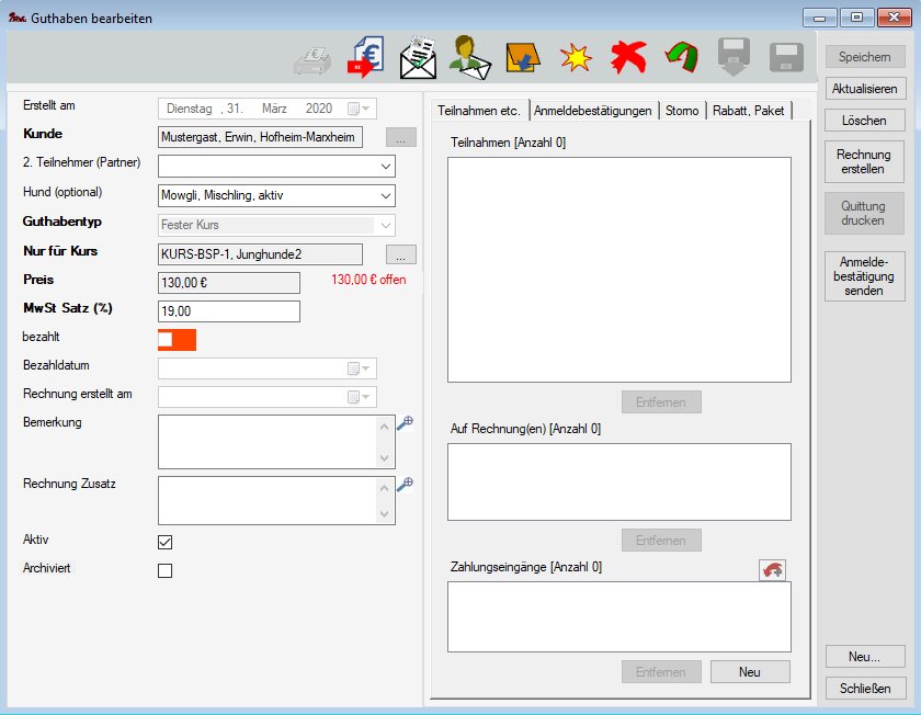 - Storno Felder: Storniert/Abgesagt, Datum Storno und Bemerkung Storno können verwendet werden, wenn das Guthaben storniert werden soll. Der Titel des Reiters erhält eine andere Farbe, wenn der Haken im Feld Storniert/Abgesagt gesetzt ist. Stornierte Guthaben tauchen auch bei Kursen und Kunden in dieser Farbe auf. Guthaben mit Teilnahmen können nicht mehr storniert werden.