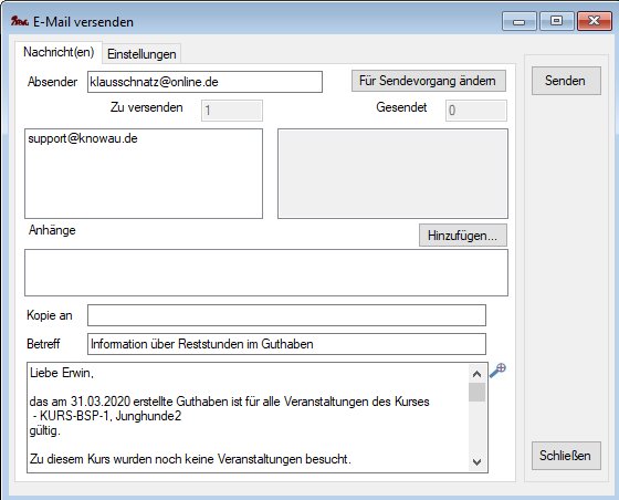 E-Mail an Kunden versenden: öffnet die E-Mail Sende-Maske zum Versenden einer E-Mail mit Guthaben-Information an den Kunden.