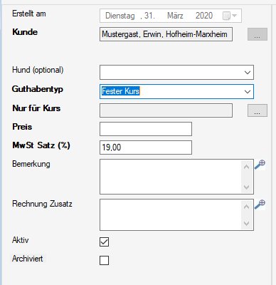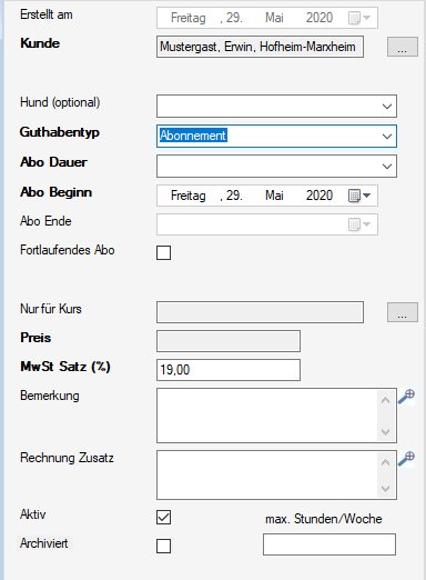Die Zuordnung eines Hundes zum Guthaben ist optional. Falls ein Hund zugeordnet wird, ist die Teilnahme an Veranstaltungen des Kurses nur für diesen Hund gültig. Ist kein Hund zugeordnet, wird bei Teilnahmen der Hund nicht überprüft.