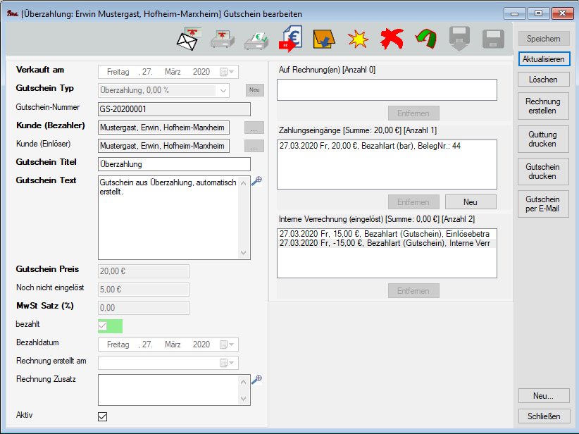 Im obigen Beispiel wurde ein Gutschein über 20,- € aus Überzahlung erstellt. Der Preis von 20.- € für den Gutschein ist als Zahlungseingang beim Gutschein aufgeführt.