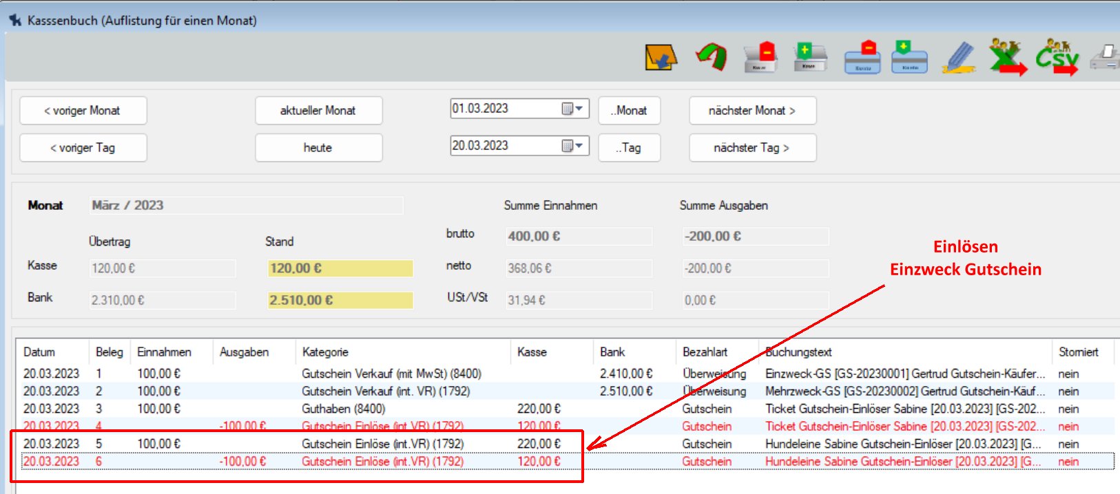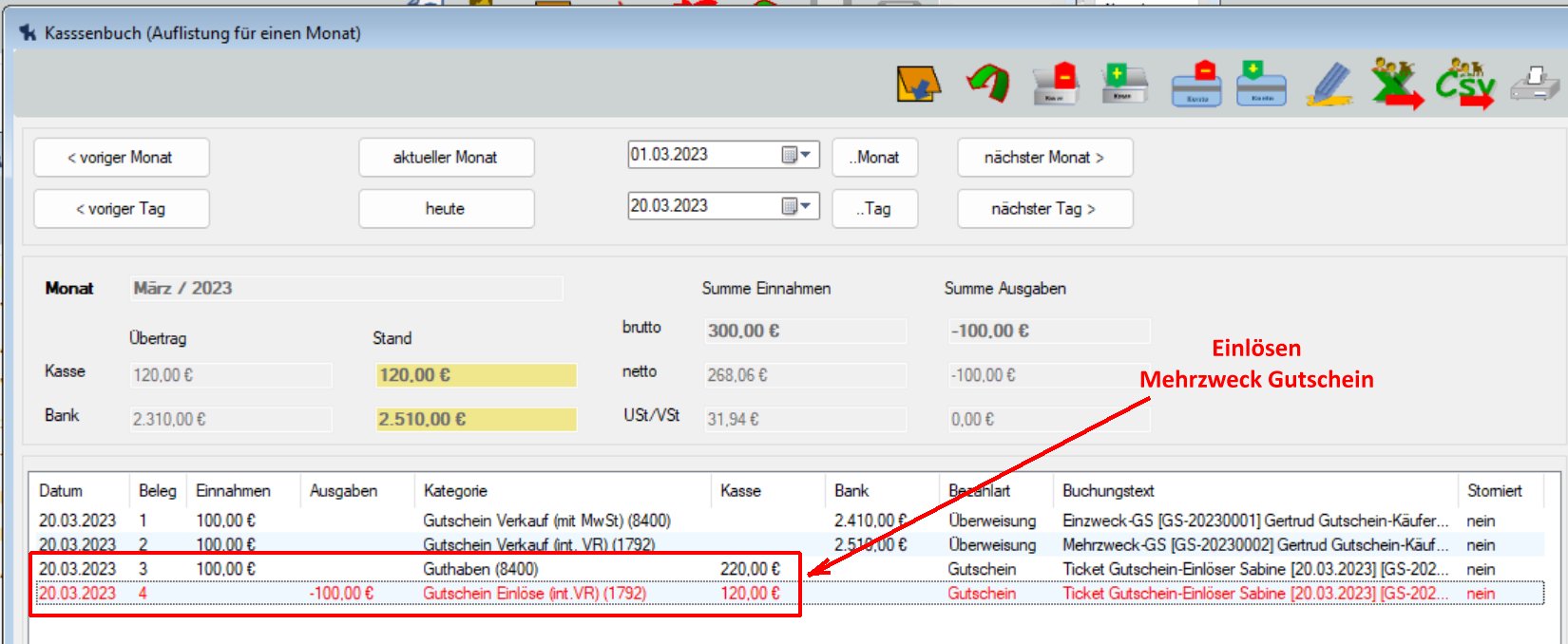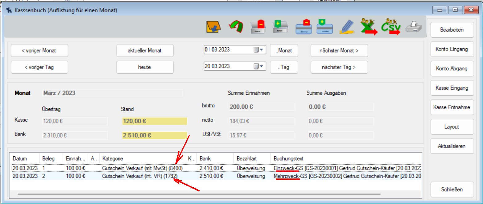 Der Gutschein mit MwSt Satz (%) = 0 ist ein Mehrzweck-Gutschein, alle anderen (mit MwSt Satz (%) nicht = 0) sind Einzweck-Gutscheine. Anhand dessen wird die Bezahlung eines Gutscheins durch den Gutschein-Käufer im Kassenbuch dokumentiert:
