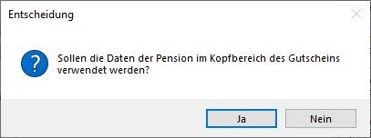 Gutschein drucken: Erzeugt eine PDF-Datei des Gutscheins. Für die Kopfzeilen werden die Rechnungsparameter verwendet. Falls der Rechnungszyklus für Pension aktiviert wurde, erscheint die Abfrage, ob für die Kopfzeilen des Gutscheins die Rechnungsparameter der Pension verwendet werden sollen.
