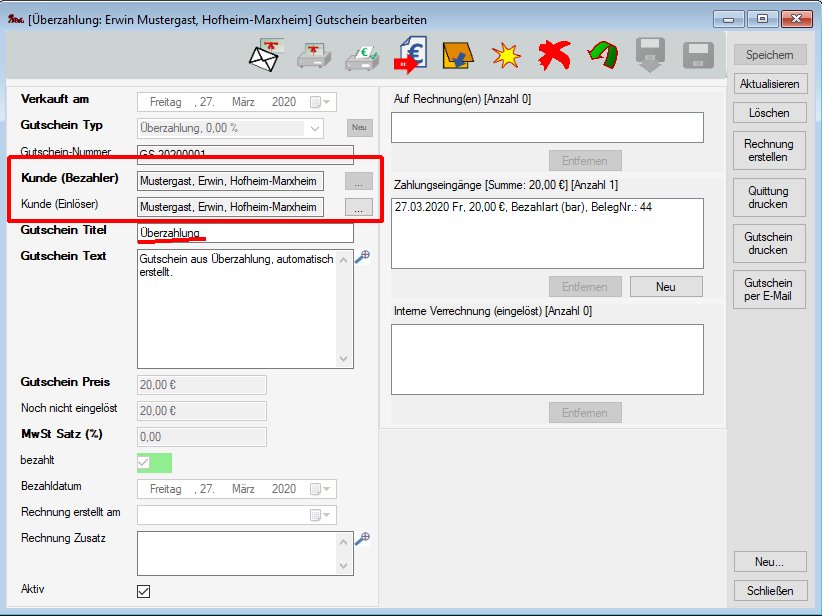 Wenn ein Gutschein beim Überzahlen erstellt wird, wurde der Gutschein mit dem Überzahlungsbetrag schon als bezahlt gebucht. Als Bezahler-Kunde wird der Kunde eingetragen, von dem die Überzahlung kommt. Derselbe Kunde ist in diesem Fall aber auch der Einlöser-Kunde. Jetzt kann der Gutschein für diesen Kunden wie Geld verwendet werden – der Gutschein ist sozusagen virtuelles Geld in der Kasse, das eigentlich dem überzahlenden Kunden gehört.