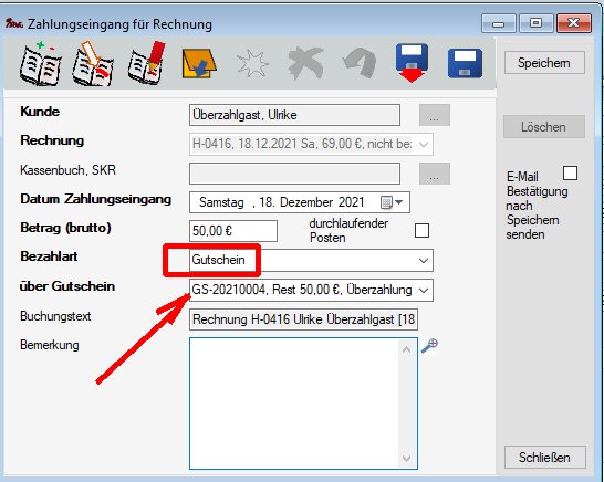 Wenn dieses virtuelle Geld für eine andere Rechnung verwendet werden soll, muss es als Zahlungseingang vom Typ Gutschein (nicht Überweisung oder bar) verbucht werden. Der Gutschein aus Überzahlung erscheint also NIRGENDS als Position auf einer Rechnung! Soll der Betrag auf eine andere Rechnung verbucht werden, geht man folgendermaßen vor: