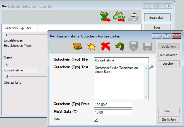 In der Listenmaske über das Menü Verwaltung->Gutscheintypen werden alle Gutscheintypen angezeigt.