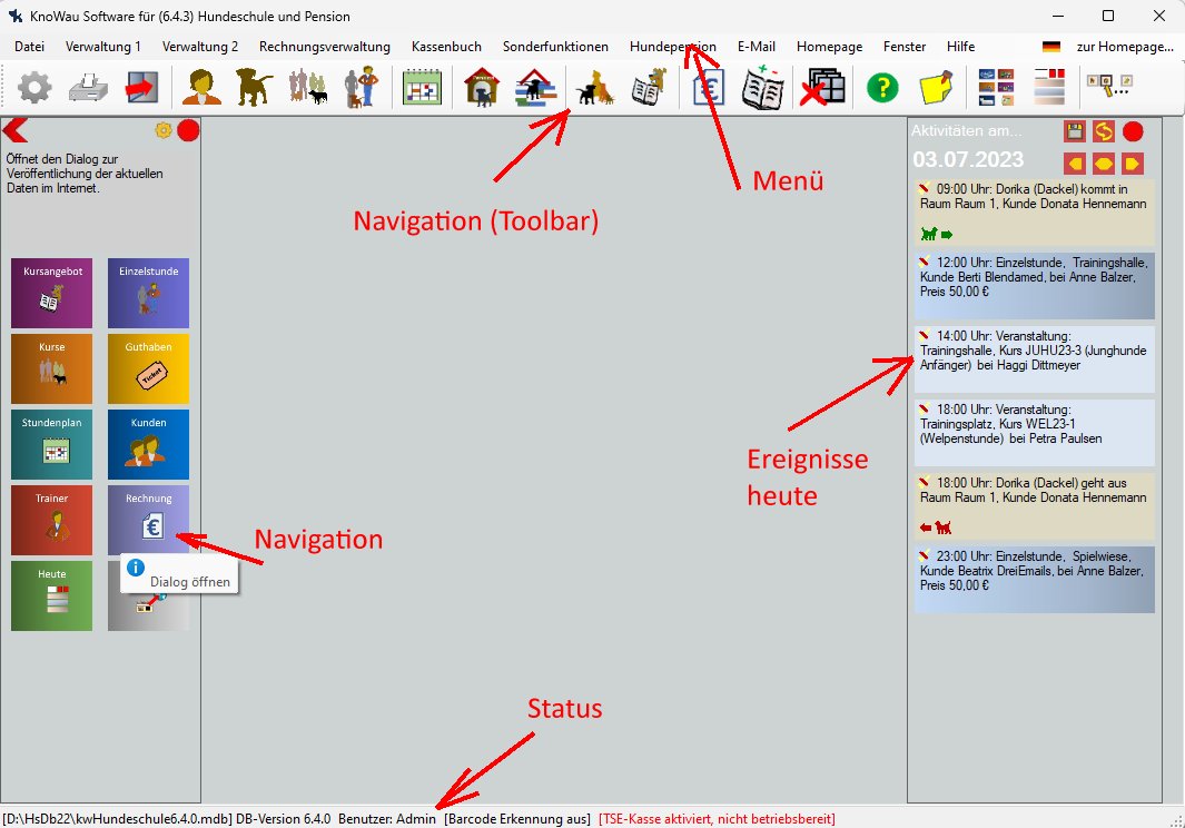Im Hauptfenster der KnoWau-Software findet man das Menü, die Toolbar, links die zusätzliche Navigation und rechts den Heute Bereich. Über Menü, Toolbar oder optional die zusätzliche Navigation erreicht man die Funktionen von KnoWau. Im Heute-Bereich werden die aktuellen Termine angezeigt. In der Status Leiste am unteren Rand werden Datenbank und angemeldete Benutzer angezeigt.