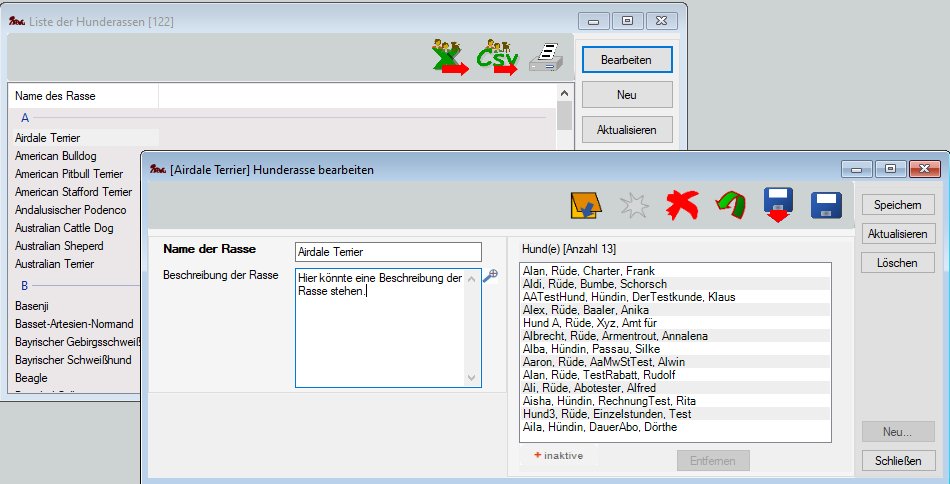In der Listenmaske über das Menü Verwaltung->Hunderassen werden alle Hunderassen angezeigt.