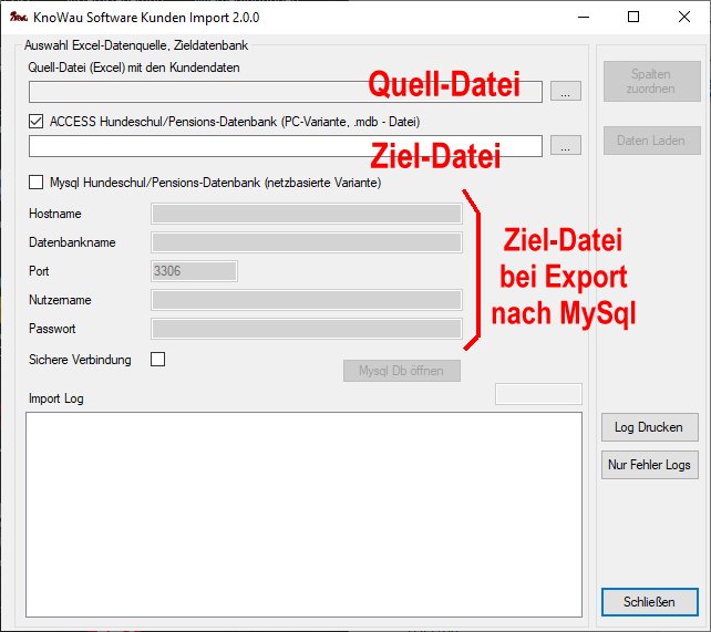 Für den Import von Kunden- und Hunde-Daten gibt es eine spezielle Anwendung, die man von unserer Homepage herunterladen und installieren kann. Wenn sie ihre Kunden- und/oder Hunde-Daten im Excel Format haben, kann die Import-Anwendung diese Daten in die KnoWau Datenbank übertragen.