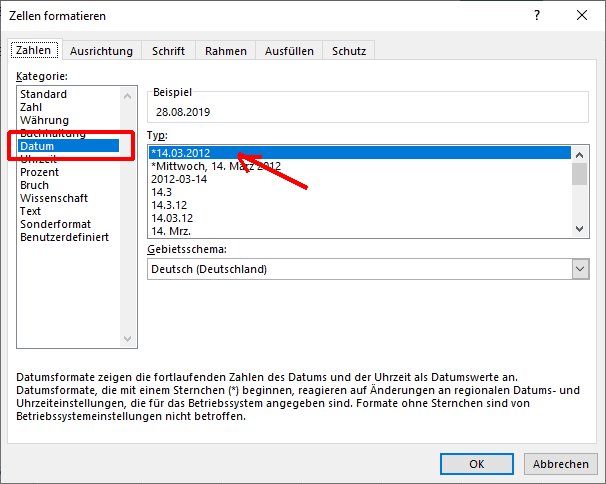 Datumsfelder in der Excel-Tabelle müssen als Datum dd.mm.yyyy formatiert werden:
