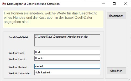 Die für die Felder Geschlecht und Kastriert beim Hund erwarteten Werte sind R/H bzw. J/N. Wenn in der Quell-Datei dafür andere Werte verwendet werden, kann man die über den Werte für Geschlecht Kastriert... Button einstellen.