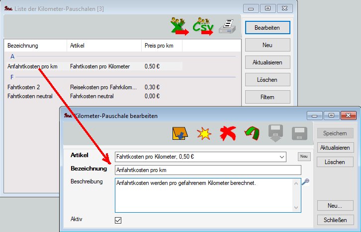 Die Liste der Kilometer Pauschalen erreicht man über das Menü Sonderfunktionen->Kilometer Pauschale.