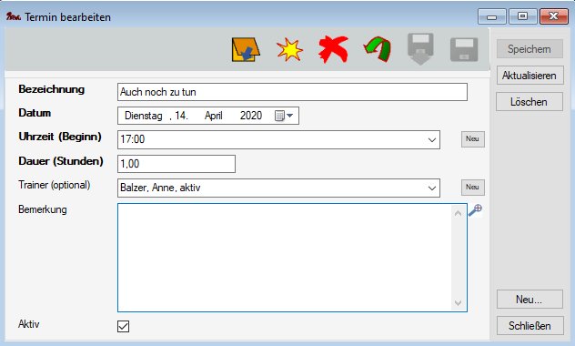 Termine können optional einem Trainer zugeordnet werden. Termine mit Trainerzuordnung tauchen im Stundenplan im Reiter des Trainers auf. Termine ohne Trainerzuordnung gelten für alle und erscheinen im Stundenplan auf dem alle Kurse Reiter.
