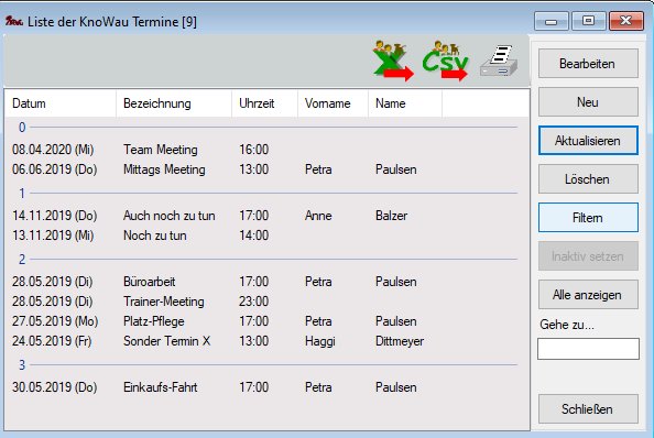 KnoWau Termine sind Aktivitäten oder Events zusätzlich zu Einzelstunden, Veranstaltungen oder Pensionsbetreuung und Kommt/Geht Ereignissen.