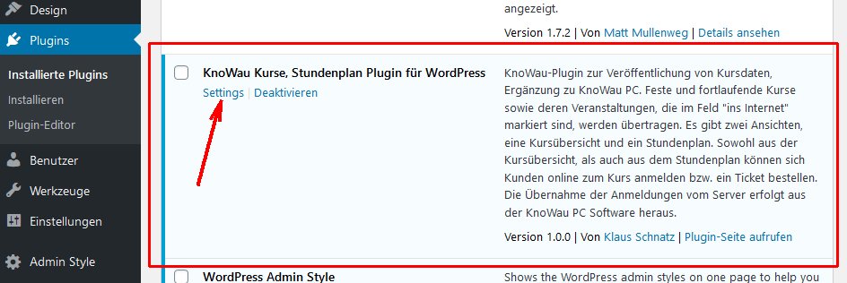 Nach Installation und Aktivierung des KnoWau Plugins auf dem Server kann man aus der Plugin Übersicht heraus Einstellungen vornehmen.