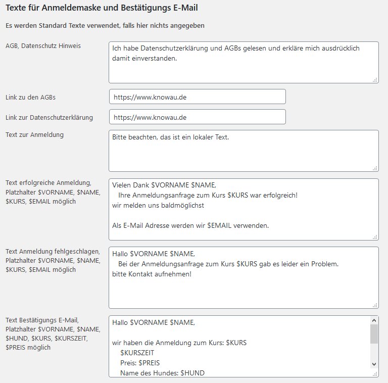 Im nächsten Teil können die Texte für die Kursanmeldung konfiguriert werden. Ist eine Angabe nicht vorhanden (leer), wird ein Standard Text verwendet.