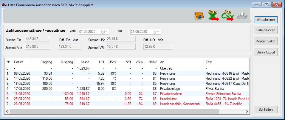 Dabei gibt es Erlöse mit 7% und 19% MwSt (1 bis 3) eine Privateinlage und Privatentnahme mit 0% (4 und 5) sowie Betriebsausgaben mit 7% und 19% (6 und 7).