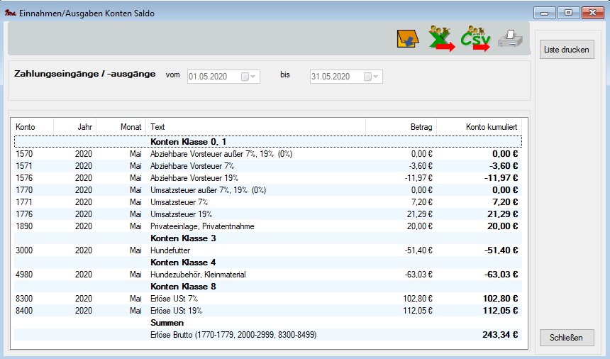 Konten Klassen und Summenkonten werden im Konten Saldo der Einnahmen/Ausgaben Liste erstellt. Ein Konten Saldo wird an folgendem Beispiel erläutert: