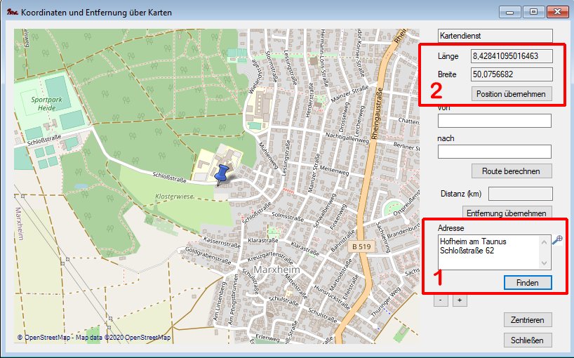 Für die Bestimmung der geografischen Koordinaten von Kundenadressen oder Veranstaltungsorten und Entfernungen verwendet KnoWau einen Kartendienst.