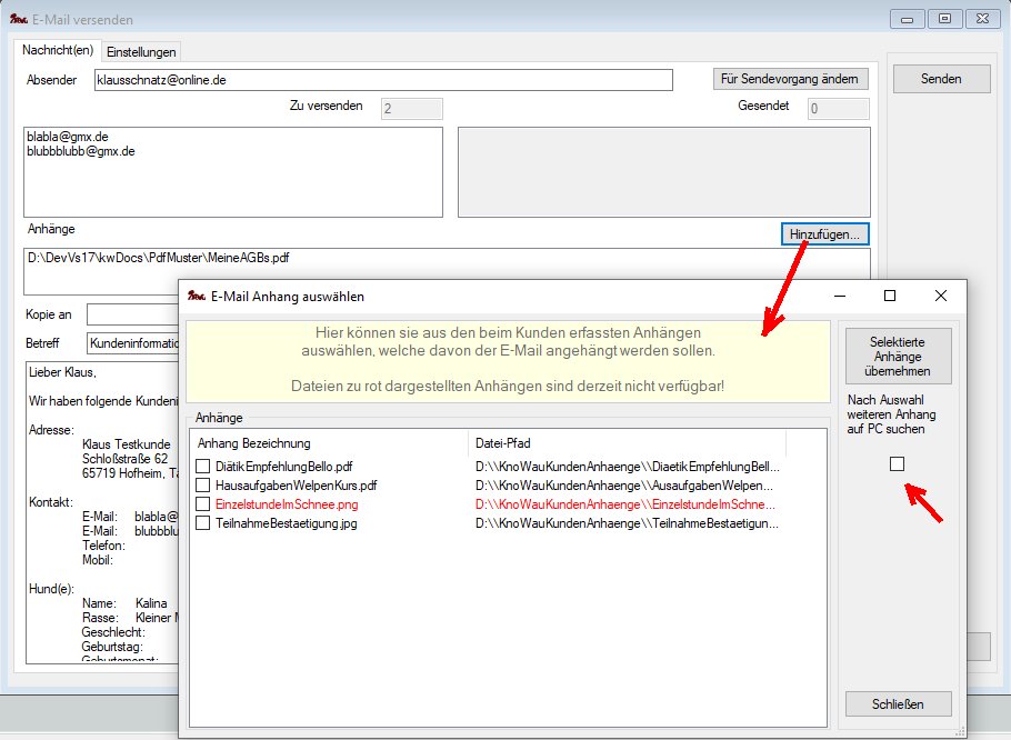Soll einer dieser Anhänge an den Kunden per E-Mail geschickt werden, kann es mühsam sein, ihn aus der Masse der als Anhang verwendeten Dateien herauszufinden. Um das Auffinden zu vereinfachen, gibt es in KnoWau einen eigenen Mechanismus. Bei Versenden einer E-Mail an einen Kunden wird geprüft, ob für den Kunden Anhänge erfasst wurden. Ist das der Fall, erscheint beim Klick auf den Hinzufügen... Button eine Liste der beim Kunden erfassten Anhänge: