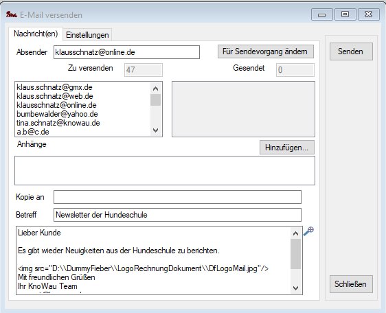 und nach Bestätigung die E-Mail Sendemaske mit vorbelegten E-Mail Adressen.