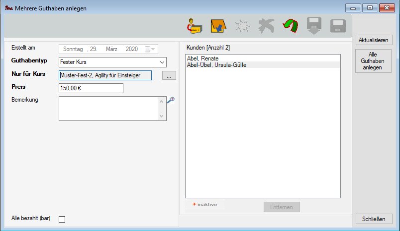 Guthaben für einen oder mehrere selektierte Kunden erstellen. Klick öffnet die Eingabemaske für mehrere Guthaben: