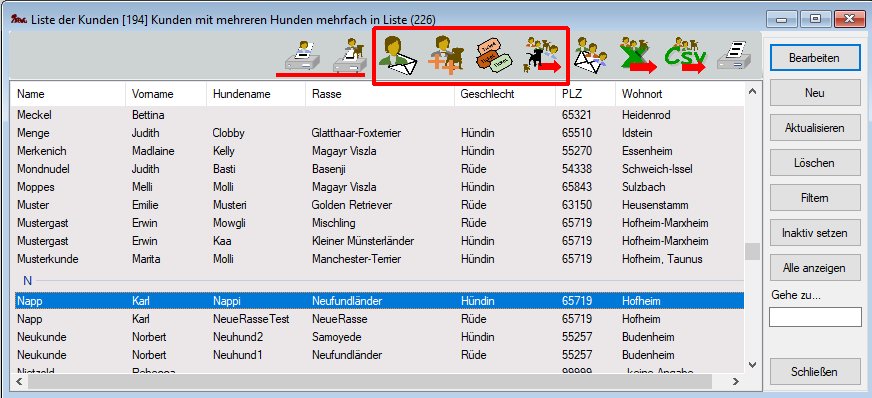 Die nicht rot markierten Icons in der Toolbar gelten für alle Kunden. Die rot markierten Icons erscheinen nur, wenn ein oder mehrere Kunden in der Liste selektiert wurden. Sie gelten dann für EINEN (rot unterstrichen) bzw. MEHRERE (rot eingerahmt) selektierte Kunden.
