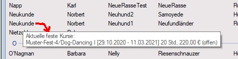 Für Pensions-Kunden ist diese Anzeige nicht von Bedeutung. Die Anzeige kann über das Menü Datei->Eigenschaften im Reiter Programmverhalten im Feld Kurs-Info in Kunden Listenmasken anzeigen ausgeschaltet werden.