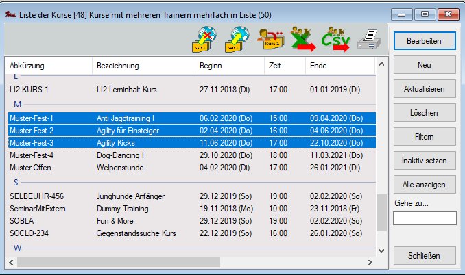 Das Anmelden zu mehreren Kursen in einem Schritt beginnt mit dem Öffnen der Kurs-Liste im Menü Verwaltung->Kurse. In der Kurs-Liste selektiert man die Kurse, zu denen der Kunde angemeldet werden soll (Eintrag anklicken, für mehrere Kurse Strg-Taste beim nächsten Klick gedrückt lassen):