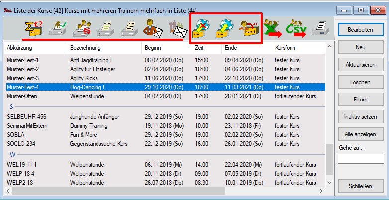 Die Liste der fortlaufenden und festen Kurse erreicht man über das Menü Verwaltung->Kurse oder das Icon