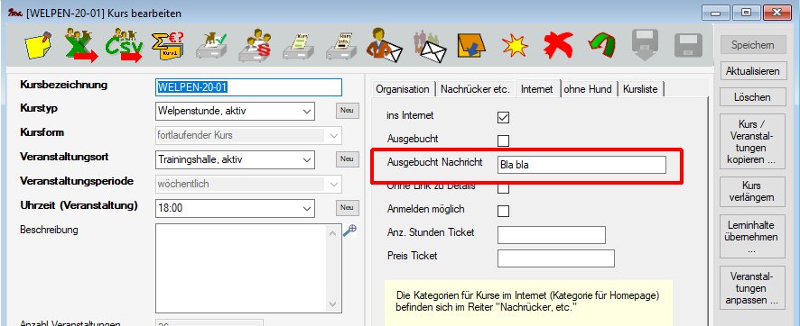 Ausgebucht Nachricht: falls nicht angegeben, steht bei ausgebuchten Kursen im Internet nur der Text ausgebucht. Hier kann ein alternativer Text festgelegt werden.
