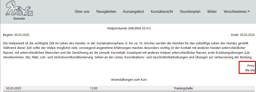 Zur Veröffentlichung genügt es, den Haken im Feld ins Internet zu setzen, oder wegzunehmen. Bei der nächsten Veröffentlichung im Internet, wird dann der Kurs übertragen (Haken gesetzt) oder nicht (Haken fehlt). Für die Darstellung stehen zusätzliche Felder zur Verfügung: