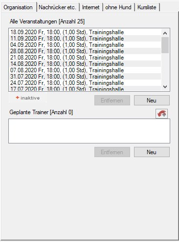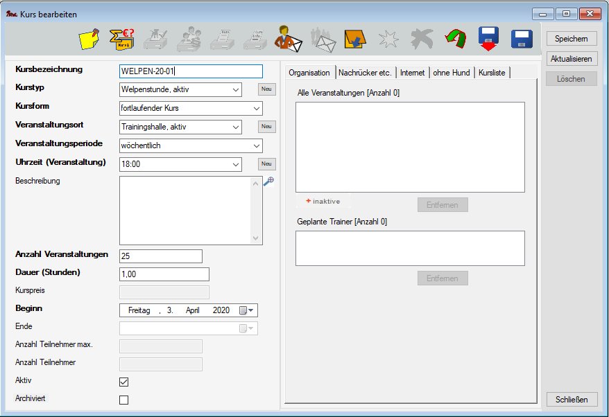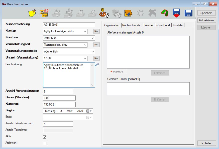 Die Bearbeitungsmaske für einen Kurs dient zur Verwaltung der Veranstaltungen und Teilnehmer dieses Kurses. Über diese Maske kommuniziert man mit Teilnehmern und Trainern. Beide Kursformen - fortlaufend und fest - können über diese Maske verwaltet werden, sie unterscheiden sich nur geringfügig.