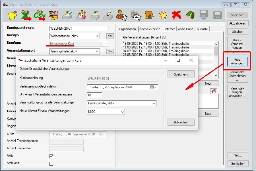 In der Bearbeitungsmaske fortlaufender Kurse gibt es den Button Kurs verlängern, mit dem zusätzliche Veranstaltungen automatisch erzeugt werden können.