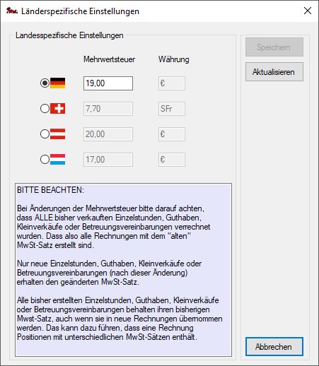 Länderspezifische Einstellungen definieren Währungssymbol und die länderspezifische Mehrwertsteuer. Man erreicht sie über das Menü Datei->Länderspezifische Einstellungen oder das Flaggen-Symbol