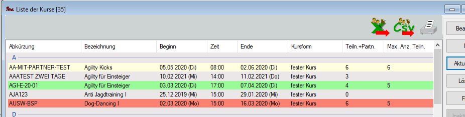 Die Farbkennzeichnung ist nur für feste Kurse mit Angebe einer maximalen Anzahl von Teilnehmern. Bei Überschritung der maximalen Teilehmeranzahl wird der Kurs in der Liste rot gekennzeichnet, bei erreichen der maximalen Teilehmeranzahl gelb und grün , falls noch Plätze im Kurs frei sind.