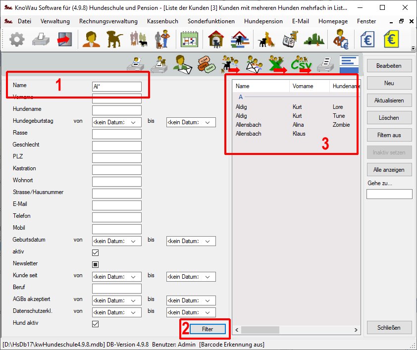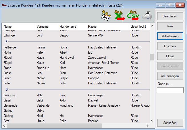 Listenmasken zeigen eine Liste alle Einträge einer bestimmten Art und liefern den Einstieg in deren Bearbeitung, zum Beispiel Kunden, Hunde, Kurse, Einzelstunden, Betreuungsvereinbarungen und vieles mehr.
