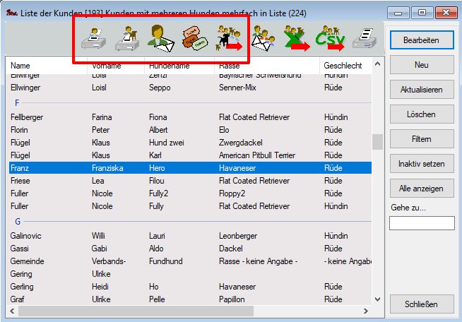 Selektiert man Listeneinträge (Kunden), erscheinen ggf. noch weitere Icons in der Toolbar, die dann nur für den oder die selektierten Einträge gelten: