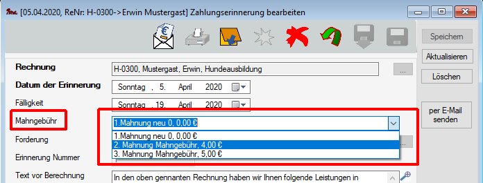 Mahngebühren können aus Zahlungserinnerungen entfernt werden. Dazu wird die Bearbeitungsmaske der Zahlungserinnerung geöffnet, die Mahngebühr im Feld Mahngebühr selektiert und die Entf Taste gedrückt.