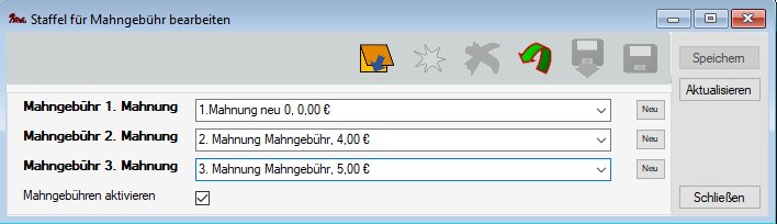 Bei Auswahl des Menüpunktes erscheint die Bearbeitungsmaske für die Mahngebühr-Staffel: