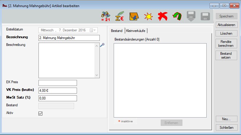 Anmerkung 2: In der Regel wird für Mahngebühren keine Mehrwertsteuer berechnet (MwSt Satz (%) = 0,00). Es gibt aber Ausnahmen, wenn es sich bei der Mahngebühr gemäß ihrer AGBs um eine einklagbare Forderung handelt. Es gibt hierzu keine einheitliche Behandlung durch die Finanzämter. Ob sie für den Mahngebühr Artikel eine Mehrwertsteuer eintragen oder nicht, sollten sie mit dem Steuerberater abklären.