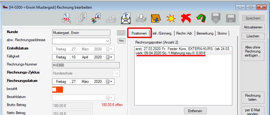 Anmerkung 1: Bei fehlendem Haken stehen die Mahngebühr Artikel in der Bearbeitungsmaske einer Zahlungserinnerung NICHT zur Auswahl zur Verfügung.