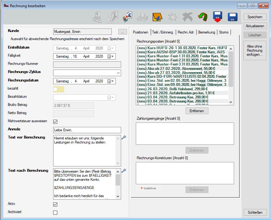 im zweiten Fall eine Bearbeitungsmaske der Rechnung, in der alle Leistungen des Kunden, die noch nicht auf einer Rechnung sind, als Rechnungspositionen vorgegeben sind.