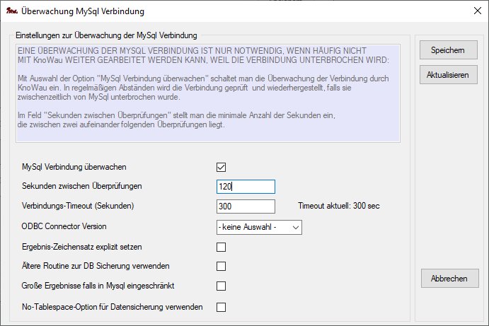 Bei Verwendung einer MySql Datenbank wird die Zeitspanne, für die eine inaktive Verbindung aufrecht erhalten wird, von der Datenbank festgelegt. Sie kann von KnoWau aus nicht beeinflusst werden. Störend wirkt sich eine zu geringe Zeitspanne beim Arbeiten mit KnoWau aus, weil man ggf. häufiger eine unterbrochene Verbindung manuell wieder herstellen muss (Menü Datei->Datenbankverbindung wiederherstellen). Im schlimmsten Fall kann dadurch kontinuierliches Arbeiten mit KnoWau stark eingeschränkt sein. Dann muss man die Einstellungen in der MySql Datenbank entsprechend erweitern (wait_timeout, connection_timeout).
