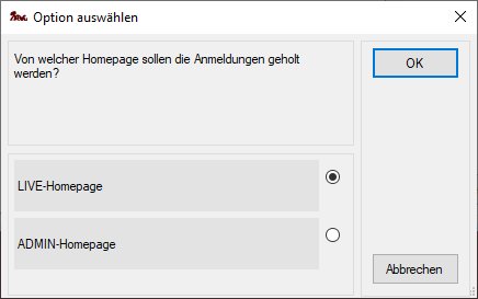 In der Regel wird man hier die Voreinstellung LIVE-Homepage verwenden. Damit werden Anmeldungen aus der LIVE-Umgebung geholt, die die Kunden auf ihrer Homepage tätigen.