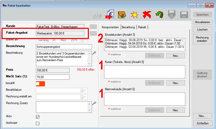 Alle Paket-Angebote erreicht man über das Menü Sonderfunktionen->Paket Angebote. Von dort erreicht man die Bearbeitungsmasken der einzelnen Paket-Angebote per Doppelklick oder über den Neu Button.
