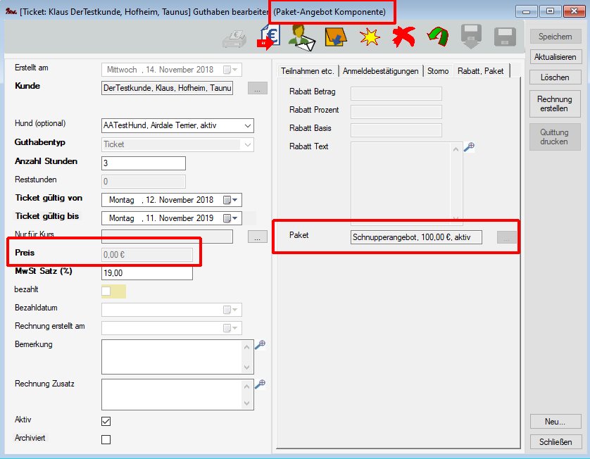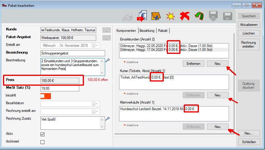 Der Preis eines Paketes wird über das Paket selbst festgelegt, so dass seine Komponenten alle den Preis 0,00 € haben. Zahlungen erfolgen für das Paket, nicht für die Komponenten.